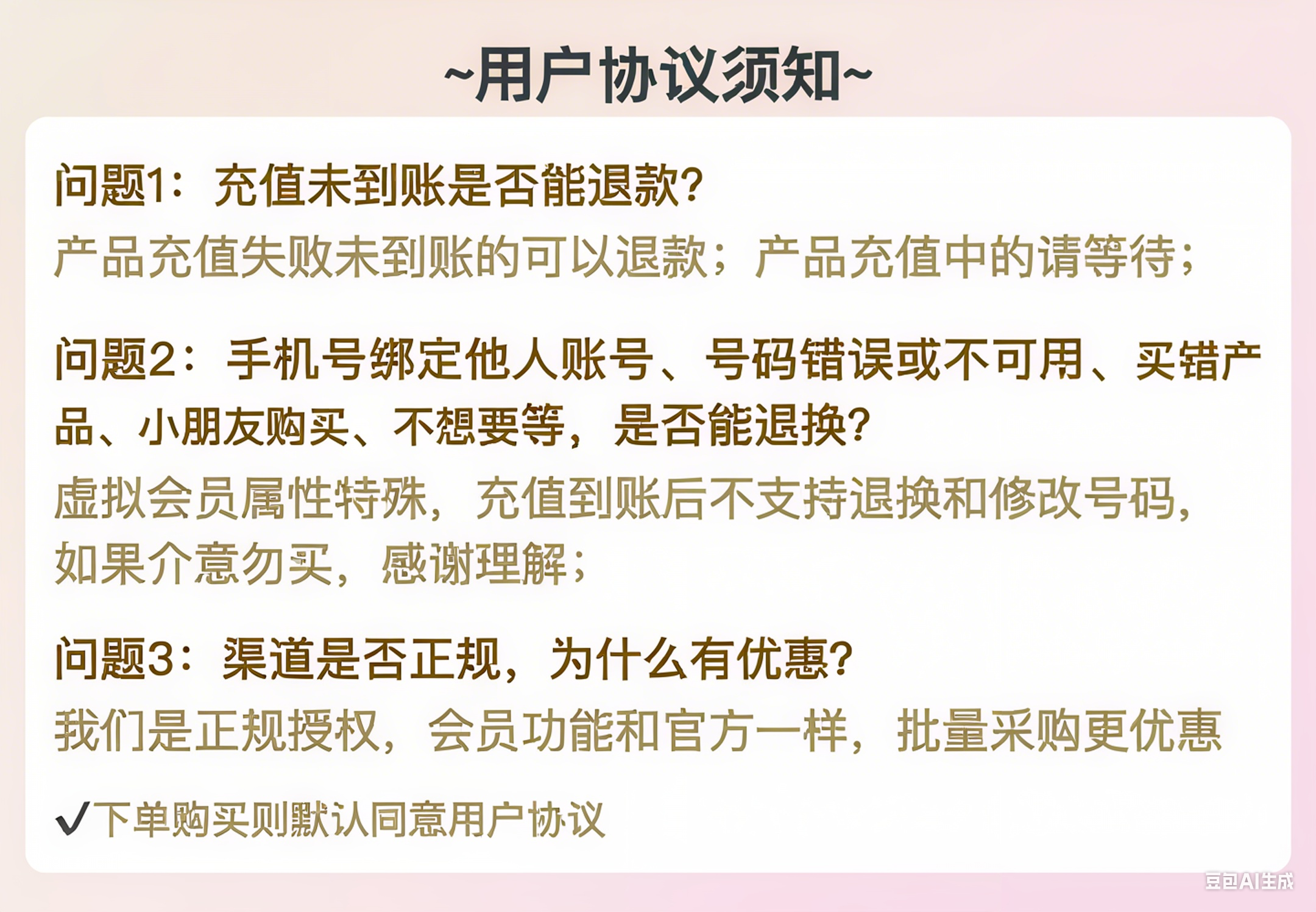3、在没有"无任何正当退款依据"的前提下,写有"一旦售出,概不支持退款"等类似的声明,视为无效声明;